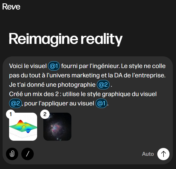 La praticité de l’interface de Reve est également un point fort. Le modèle organise tous les visuels (ceux donnés en référence et ceux générés) dans un album. Cet album fonctionne comme une conversation, à l’instar d’un historique sur ChatGPT. L’utilisateur a la possibilité de « taguer » ou « arobaser » les visuels avec leur numéro directement dans son prompt. Cette fonctionnalité est révolutionnaire : elle évite de devoir décrire les visuels de référence ou de faire du méta-prompting pour que l’IA comprenne de quel visuel on parle. De plus, Reve permet d’améliorer directement la résolution des visuels générés depuis l’interface, un gain de temps considérable en production.
