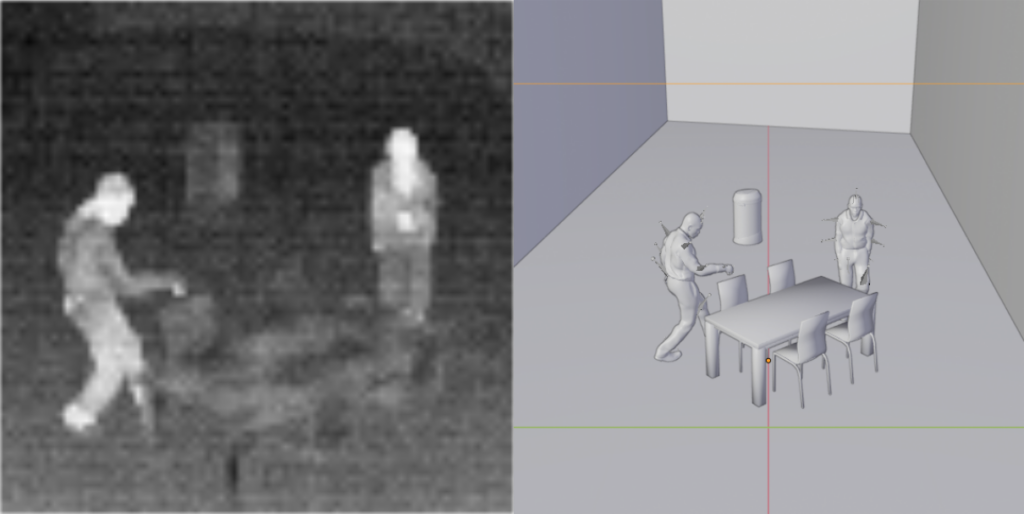 Sur un projet de R&D interne visant à travailler sur la détection de chutes de personnes sur des images infrarouges, la cellule R&D a eu recours à un moteur physique et 3D pour créer des scènes animées représentant des chutes. Un rendu infrarouge a ensuite été appliqué à ces scènes.