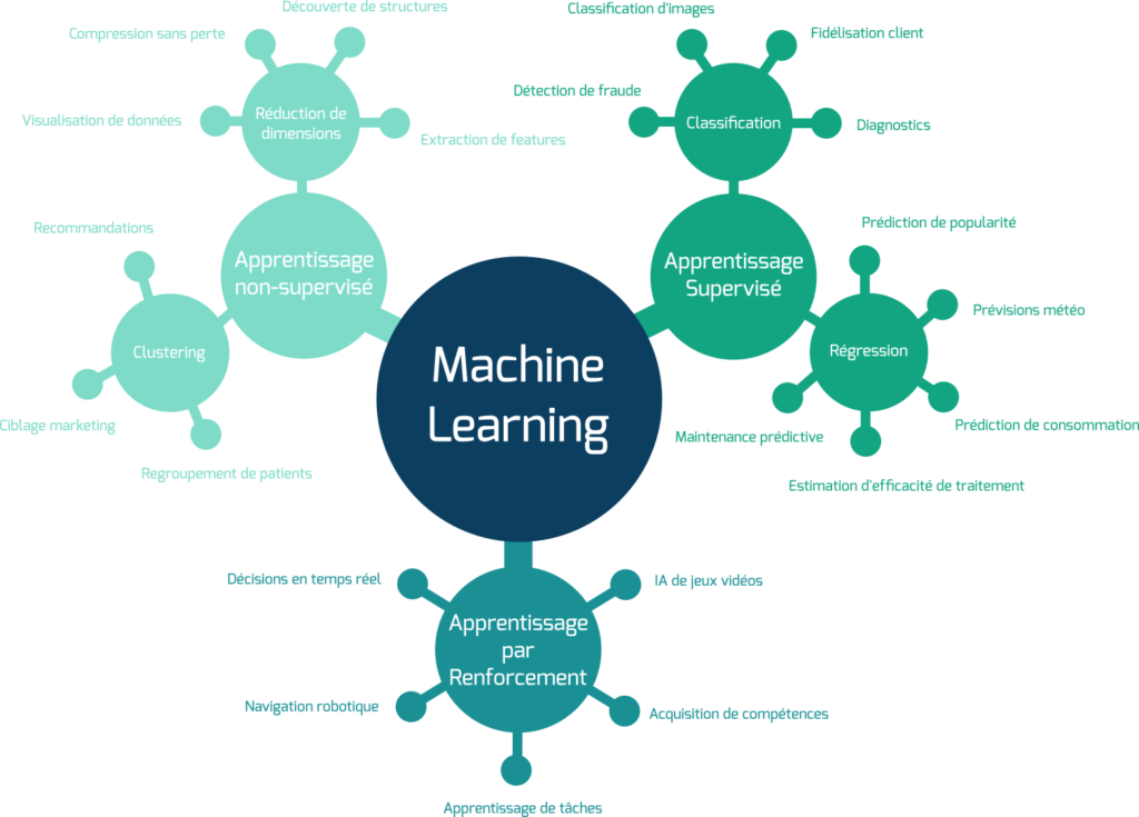 On vous a parlé un peu plus tôt d’apprentissage supervisé. Mais vous avez aussi entendu parler d’apprentissage non-supervisé voire même d’apprentissage par renforcement. Il est donc important d’expliquer clairement la distinction entre ces catégories d’apprentissage automatique.