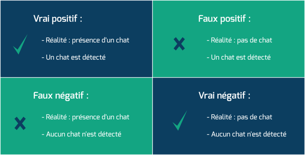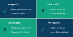 Prenons l’exemple d’un classifieur de chats – les revoilà. La classe “Chat” est donc la classe positive, et “Pas de chat” est la classe négative. On observe une vidéo. Si un chat y est présent, c’est un positif, sinon c’est un négatif. Ensuite si la prédiction du modèle est correcte, on dit que c’est vrai (positif ou négatif) et sinon que c’est faux.