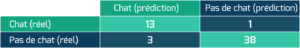 Ici la matrice montre que pour les 14 vidéos où l’on peut réellement voir un chat, le modèle l’a correctement analysé 13 fois (cela correspond donc au rappel). Et sur les 41 vidéos ne présentant aucun chat, il ne s’est trompé qu’une seule fois.