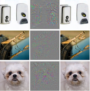 Un des exemples les plus célèbres est celui visant AlexNet, une architecture de réseaux de neurones convolutifs. Vous ne le percevez pas, et c’est normal, mais toutes les images que vous pouvez observer à droite de la première image sont classifiées comme étant des autruches. Ceci à cause de l’ajout d’un bruit imperceptible aux données en entrée.