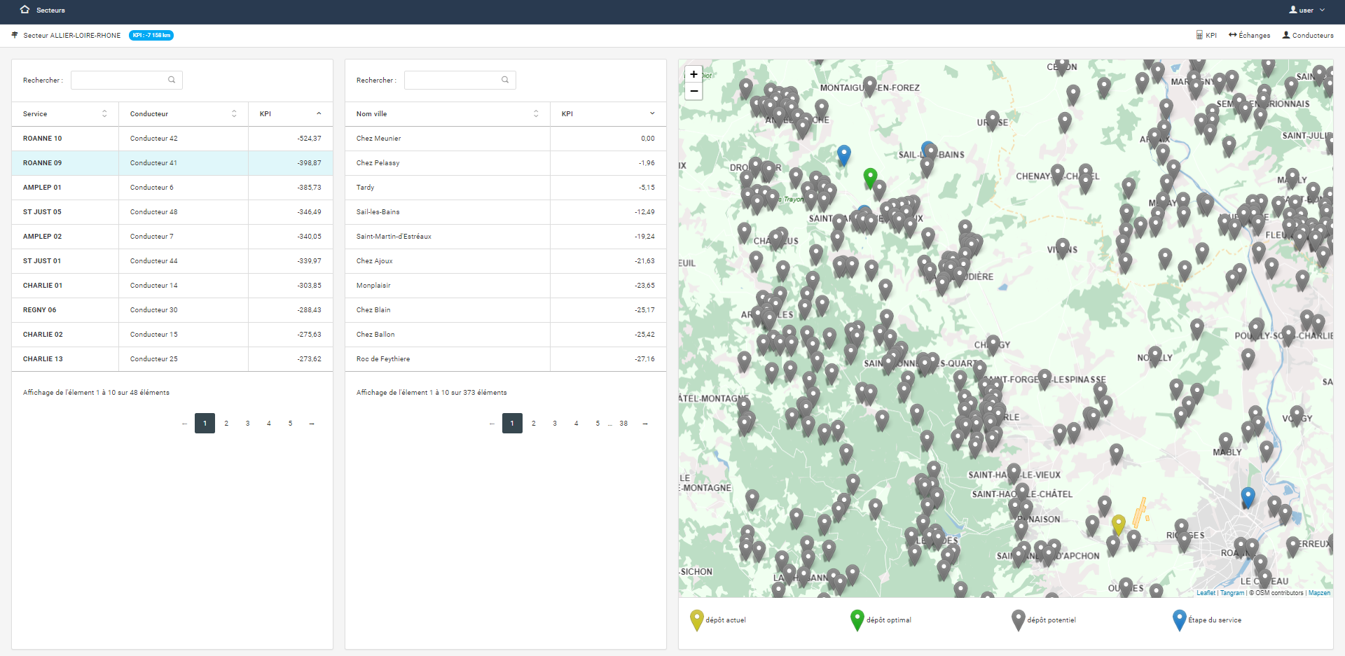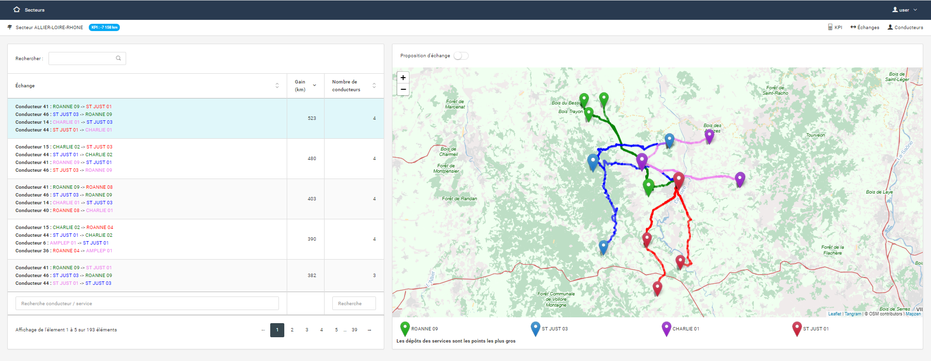 Pour que l’utilisation de cet outil soit plus ergonomique pour Transarc, Neovision a ensuite développé une application web nommé Facteur K. Elle permet de visualiser sur une carte, grâce à une mise en couleur, les dépôts potentiels ou bien de simuler les échanges de tournées entre conducteurs que l’on souhaiterait faire.