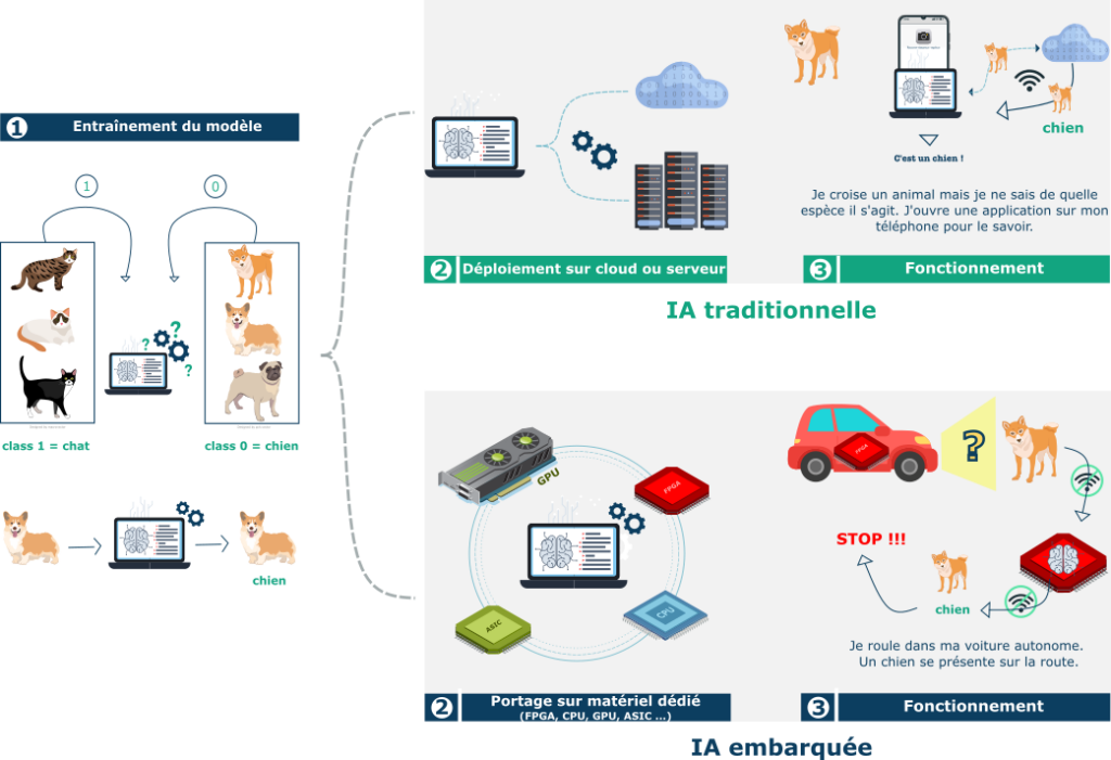 A titre d’exemple, une IA embarquée sur un smartphone ou dans une voiture autonome n’aura pas le même matériel, ni les mêmes algorithmes. Les contraintes seront donc différentes.
