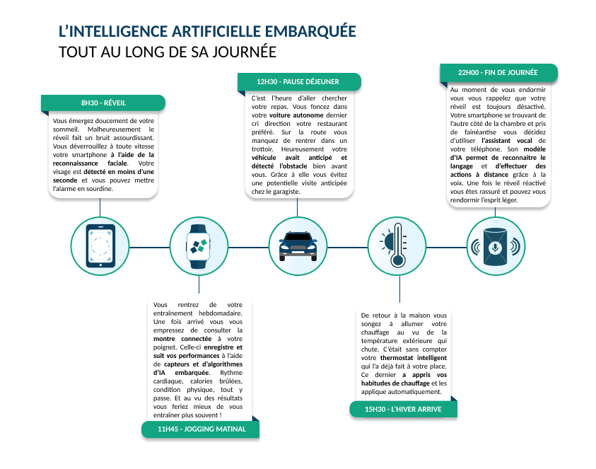 L’IA embarquée est de plus en plus présente dans notre vie quotidienne. Difficile aujourd’hui d’imaginer passer une journée sans y avoir recours. Smartphones, montres connectées, voitures autonomes, thermostats intelligents et assistants vocaux … tous utilisent des algorithmes de machine learning pour offrir une meilleure expérience utilisateur. En image, une journée rythmée par l’IA embarquée !